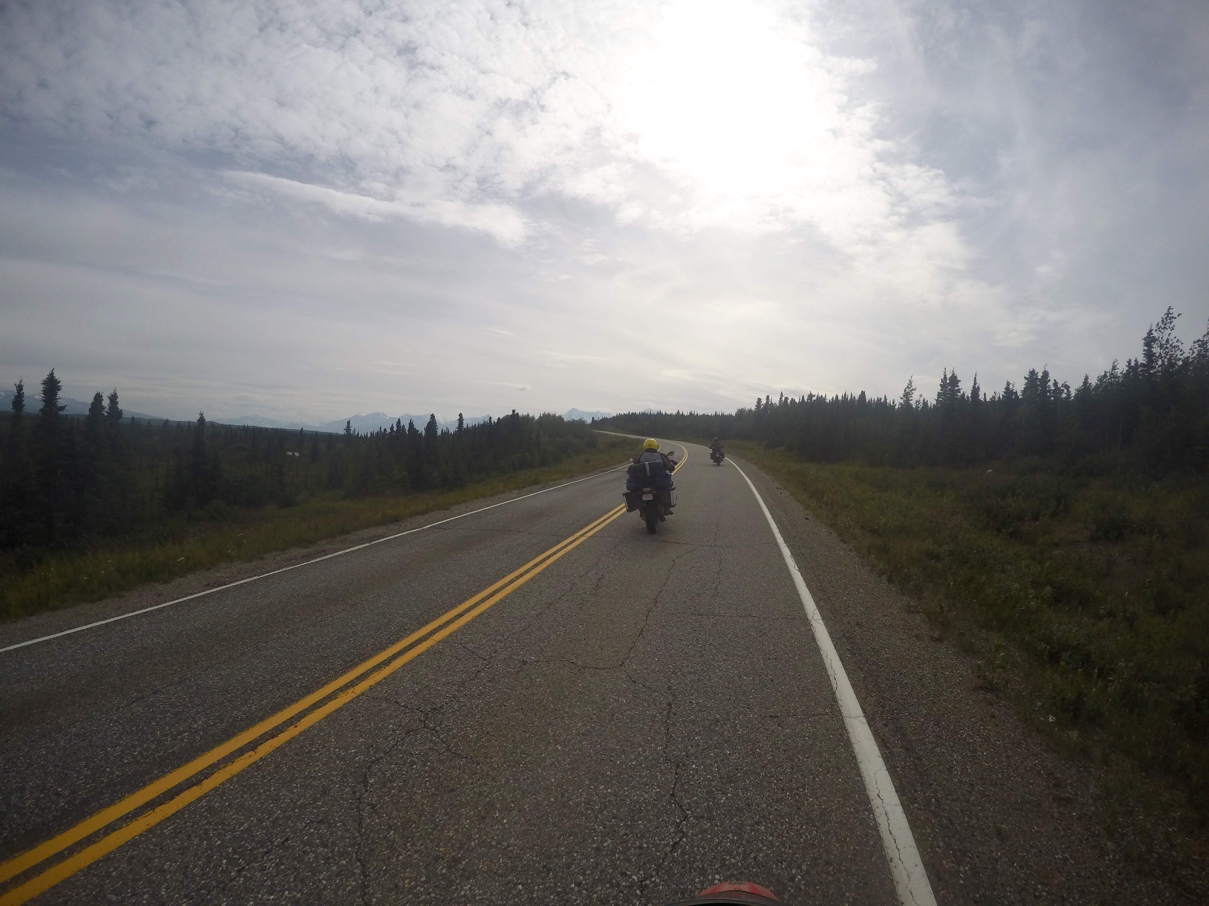 At a rest stop, I met four bikers heading my way—just down from Deadhorse, they had plans to push on through Delta Junction and camp somewhere along the Denali Highway itself. Based out of San Diego, San Francisco, and Seattle, they were my kind of people. For the first time this trip, I rode in formation.
