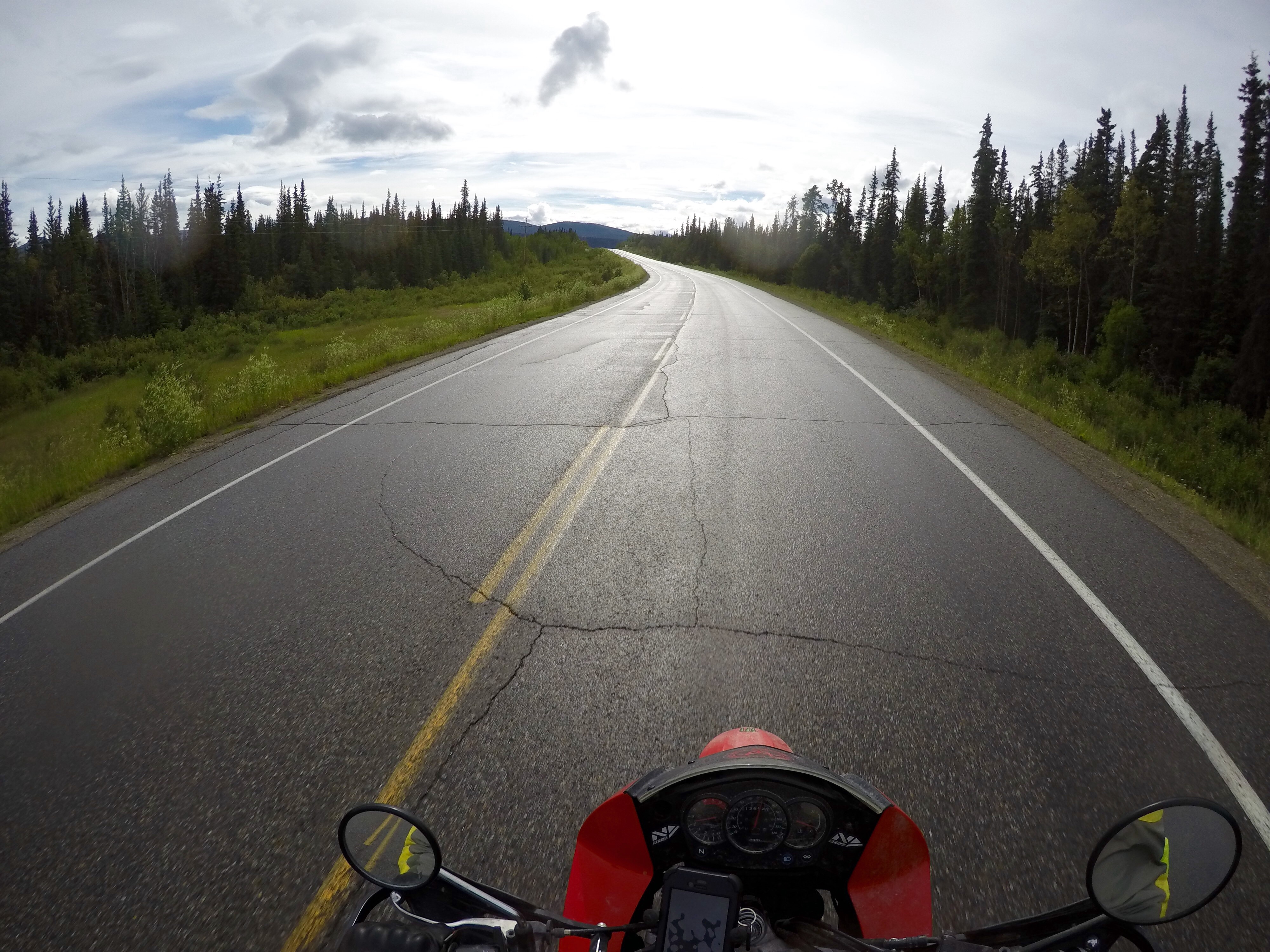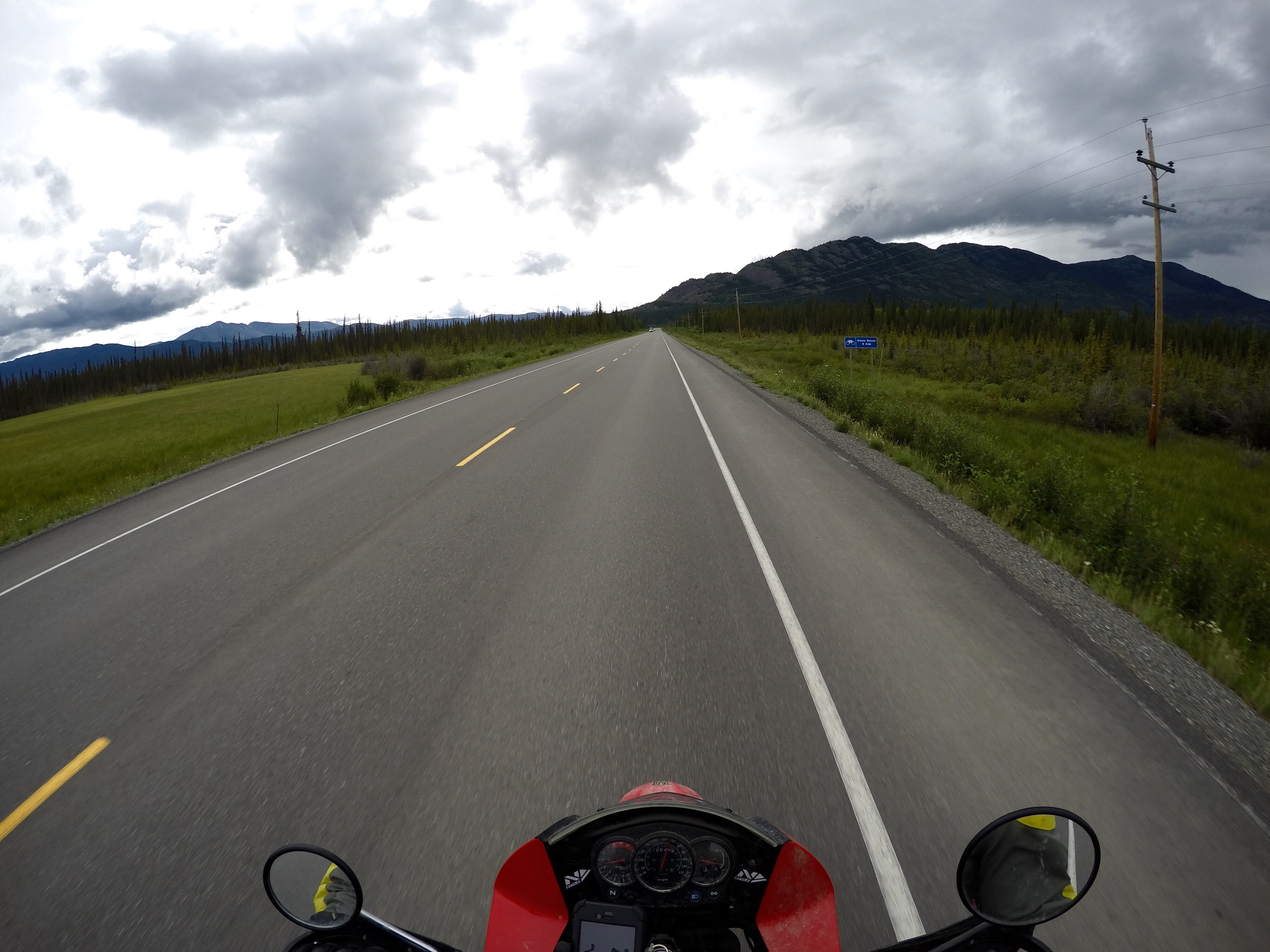 That is to say, the bike experienced total power failure about 80 mi out of Whitehorse. While cruising at 90 KMPH, suddenly I'm fully engine-braking.