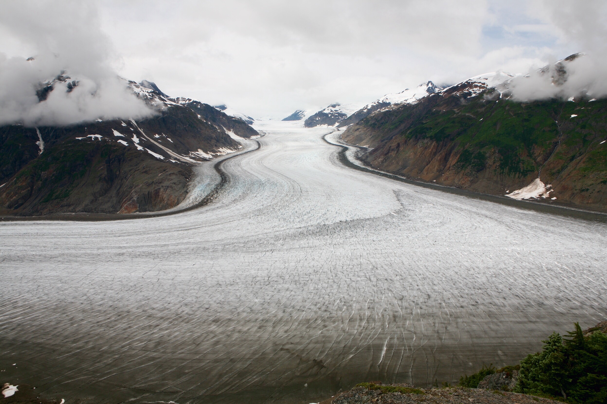 I said goodbye to Dave at around 8:30am—he needed to lay down some miles toward home, but I was told not to miss Stewart and Hyder under any circumstances. The two towns are about a mile apart, are on a inlet of the Pacific Ocean, are separated by the Canada / Alaska border, and are on a 40 mi spur highway off the Cassiar.
