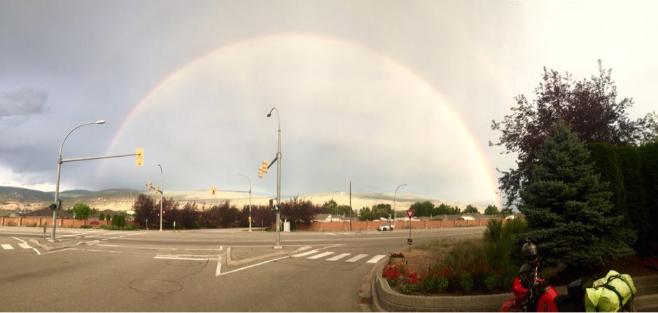 Penticton was a welcome sight. Coming I along the lake, the evening light combined with he clouds to form an enormous double rainbow: